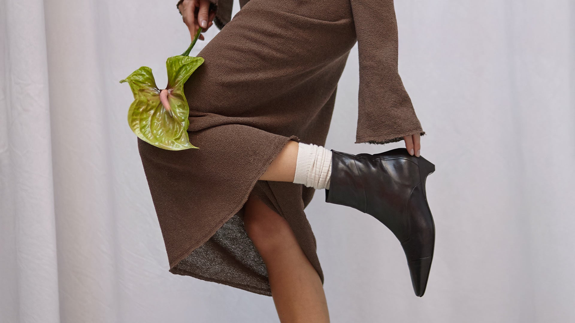 Stivaletto in nappa testa di moro con punta quadratina asimmetrica e tacco conico
