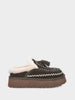 Sabot in crosta di montone beige con ricami e nappine su platform