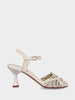 La tomaia, realizzata in nappa, è arricchita da listini verdi e bronzo intrecciati, disegnati a losanga e posizionati con geometrie studiate nel guardolo e sulla pianta. Il risultato è un equilibrio perfetto tra grafismo e sensualità. La punta quadrata stondata ne accentua il carattere contemporaneo, mentre il tacco a calice da 70 mm regala una silhouette elegante e stabile. La suola in cuoio, sinonimo di lavorazione artigianale, conferisce un ulteriore tocco di pregio.