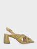 The upper, in green calfskin, is designed with crossed and overlapping straps on the footbed that naturally embrace the foot, providing support and movement. The round toe softens the line, while the wide and curved 70 mm tail heel offers stable walking without sacrificing femininity. The heel strap completes the structure, enhancing the silhouette with a balanced touch. The rubber sole ensures excellent stability and versatility.