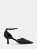 Made of black calfskin, it is open on the sides and enhanced by an ankle strap that adds elegance and stability to the fit. The square-pointed toe accentuates the silhouette, while the hollowed rectangular tail-section heel, wrapped in leather and measuring 50mm, provides character and solidity. The rubber sole completes the shoe, ensuring practicality and durability.