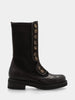 Made of dark brown calfskin, this 3/4 boot stands out for its rounded toe and smooth upper, enriched with external metal buttons that highlight its profile with a sophisticated and modern touch. The side zipper ensures a practical and comfortable fit, while the 20mm block heel offers stability and discreet elegance, perfect for everyday wear. The rubber sole provides comfort and flexibility, completing a versatile model full of personality.