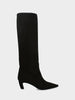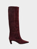 Crafted from burgundy suede, this boot features a pointed toe and a soft, slouching shaft that drapes naturally around the leg for a couture-inspired slouch effect. The 50mm curved heel gives the model a sculptural and iconic profile, elegant yet perfectly balanced. The rubber sole ensures stability, comfort, and lightness for everyday urban wear.
