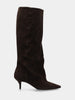 Cette botte haute en daim marron foncé se distingue par son bout effilé, qui allonge élégamment la ligne du pied, et par la guêtre retournée à l'avant, un détail couture qui ajoute du mouvement et une touche d'originalité sophistiquée. Le talon calice de 60 mm en forme de queue dessine une silhouette harmonieuse et moderne, tandis que la semelle en caoutchouc assure confort, flexibilité et stabilité. Le design, épuré mais impactant, est pensé pour incarner la féminité contemporaine avec élégance et caractère.