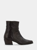 Réalisé en nappa marron, ce bottillon se distingue par son bout effilé et sa tige avec demi-bout et gaufrages sur le cou-de-pied, qui apportent mouvement et personnalité à la silhouette. Le talon bloc de 40 mm, gainé de cuir, garantit stabilité et confort, tandis que la fermeture éclair latérale assure un chaussant pratique et discret. La semelle en caoutchouc complète le modèle en offrant flexibilité et confort, idéal pour une élégance quotidienne au goût raffiné.