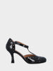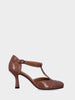 Décolleté T-bar in vernice marrone con punta tonda e tacco rocchetto