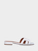 La tomaia, in vitello beige, è costruita con una fascetta centrale infilata a listini geometrici: uno rettangolare al centro e due arcuati ai lati esterni, creando un motivo architettonico che valorizza il piede con eleganza. La punta quadrata conferisce carattere al design, mentre il tacco basso da 10 mm ne garantisce la portabilità durante tutta la giornata. La suola in cuoio rifinita artigianalmente assicura eleganza e durata.