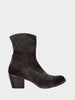 Realizzato in vitello nero, questo stivaletto si distingue per la sua punta sfilata e per la costruzione artigianale che valorizza ogni dettaglio. Il puntale, la tomaia e lo sperone cuciti e rivoltati ne sottolineano la lavorazione di pregio e il carattere deciso. Il tacco largo da 60mm, fasciato in cuoio, assicura stabilità e slancio, mentre la cerniera laterale garantisce una calzata comoda e pulita. La suola in cuoio lavato conferisce un aspetto vissuto e raffinato, completando il design con un tocco distintivo di qualità artigianale.